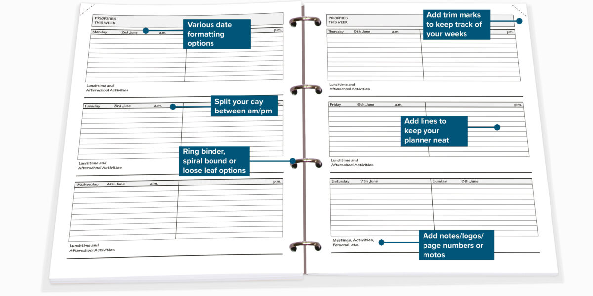 Each school has its own special way of planning. With our custom planners, you only pay for the pages you need and get to decide what goes in your planner. You can choose everything from the number of periods per day to the type of binding. Our planners have customizable designs, dated or undated sections, important school info, and pre-filled dates. They come in A4, B5, or A5 sizes with full-color covers and different binding options like ring binder or wiro binding.